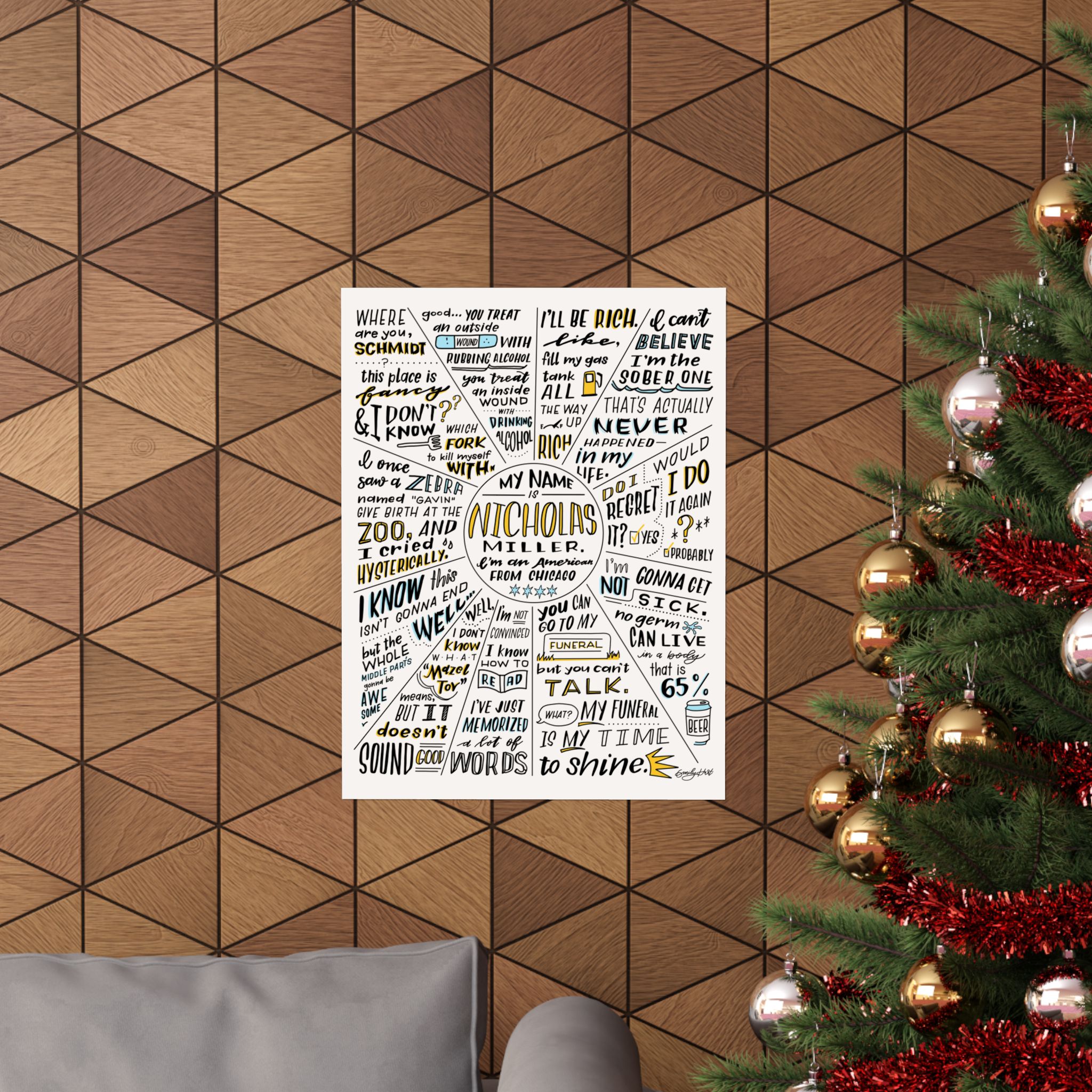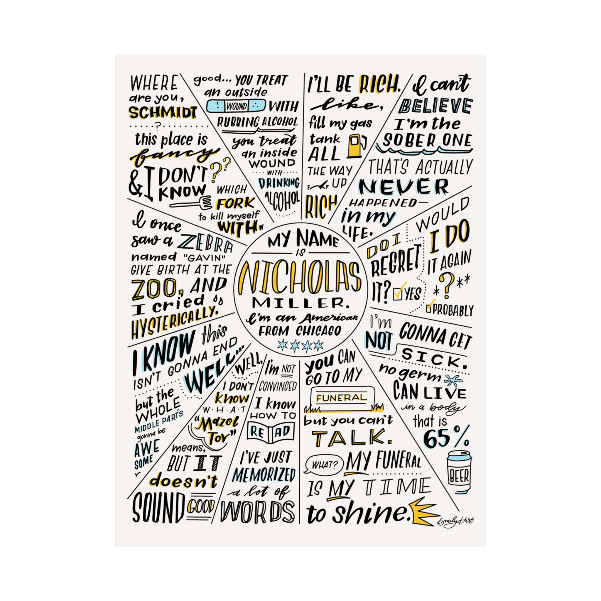 Highly requested poster from viral TikTok Video. New Girl’s Nick Miller (portrayed by Jake Johnson) quotes, as illustrated by Emily Hurt (@kerningiscaring).